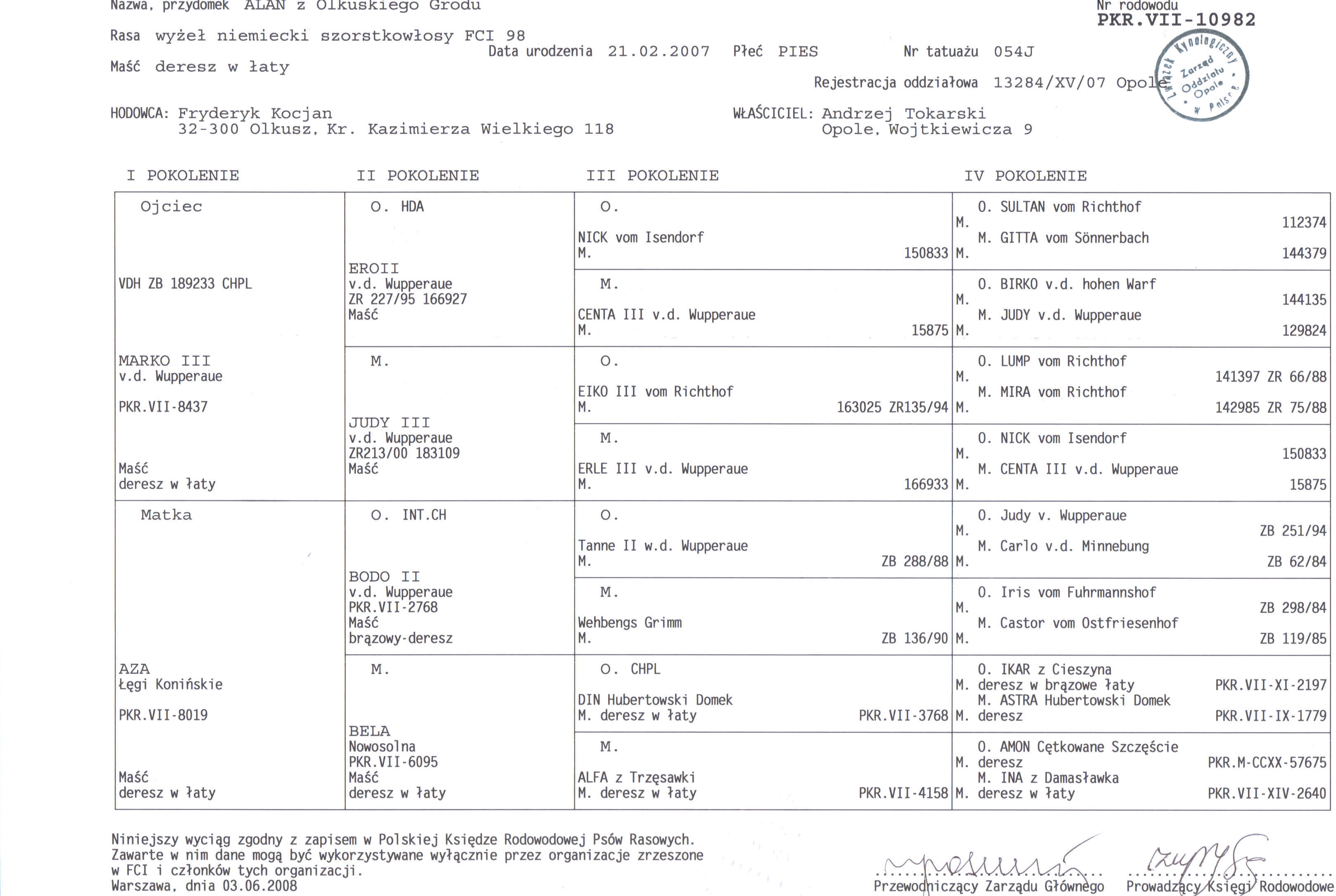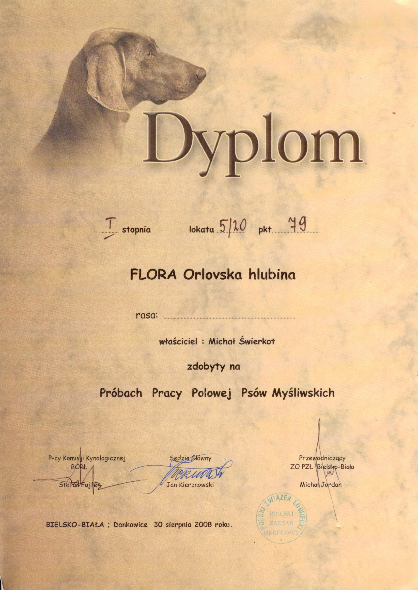 Z prawdziwą przyjemnością pragnę również kolegów myśliwych poinformować, że w moim kole pojawił się bardzo dobry miot wyżłów niemieckich szorstkowłosych. Importowana z Czech ładna eksterierowo, ale przede wszystkim o doskonałych cechach użytkowych (miałem okazję sam się o tym przekonać) suczka FLORA Orlovska hlubina kolegi Michała Świerkota urodziła 24 maja piękne szczeniaki po jednym z najbardziej utytułowanych psów tej rasy w Polsce, mającym swoje korzenie w najlepszych niemieckich hodowlach wyżła szorstkowłosego ALAN-ie z Olkuskiego Grodu. Ojciec miotu jest jednocześnie psem o wspaniałych predyspozycjach łowieckich, jest wykorzystywany między innymi, ze znakomitym skutkiem w łowiskach ze zwierzyną grubą (dokumenty psa i zdjęcia w załączeniu). Miejmy nadzieję, że szczeniaki z tego miotu trafią w ręce myśliwych, którzy potrafią wykorzystać ich wrodzone predyspozycje i stworzyć podstawę dla rozwoju tej rasy w naszym regionie.