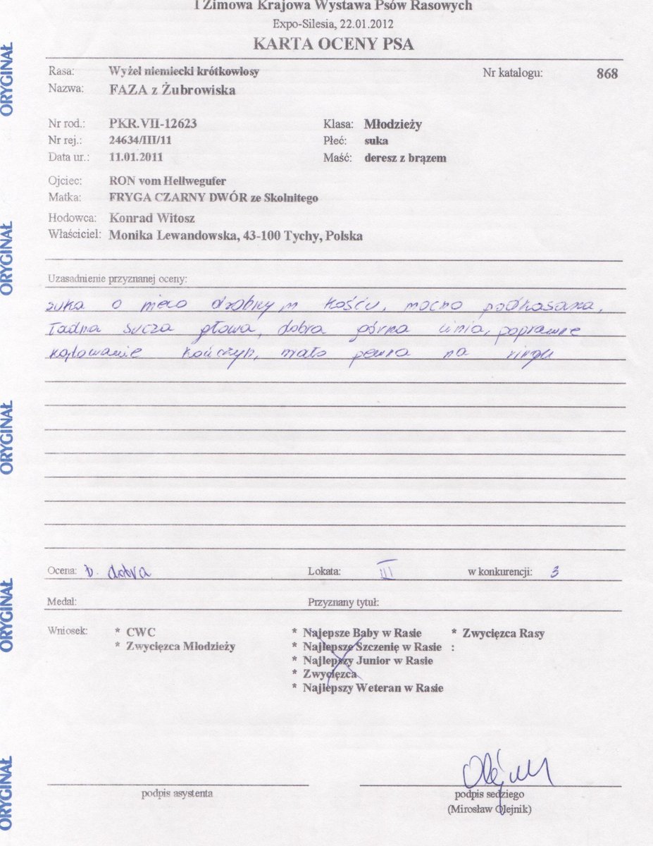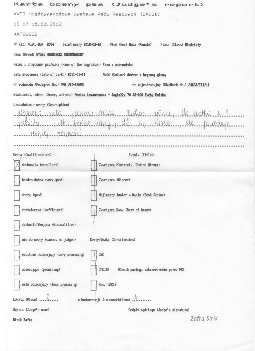 - Karta oceny – Międzynarodowa Wystawa Psów Katowice 16.03.2012 r. – klasa młodzieży