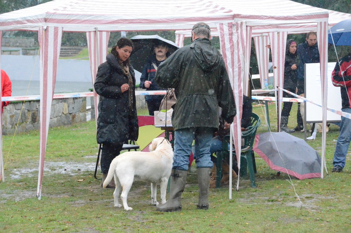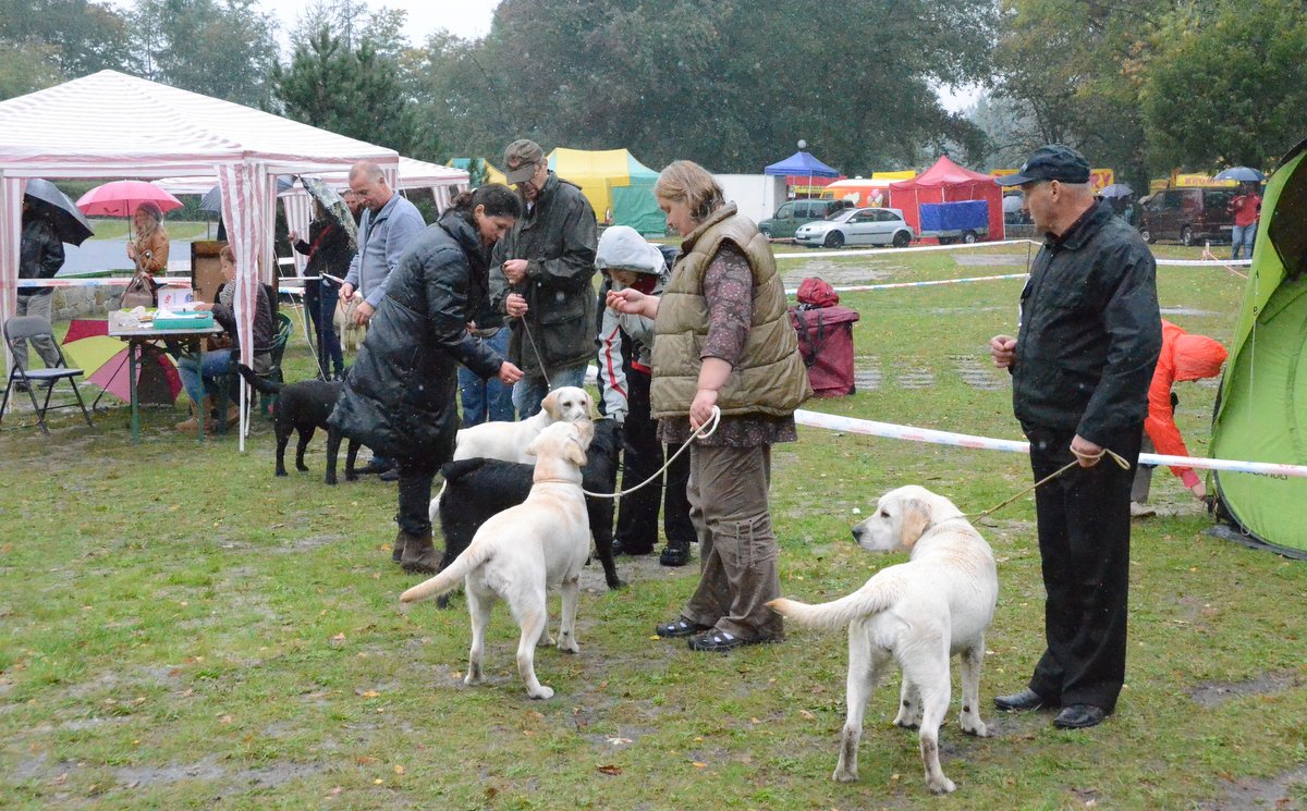 Rybnicki oddział Związku Kynologicznego, w którym działam od pewnego czasu, organizował w dniach 6 i 7 października kolejne wystawy – 6.10. Wystawę Psów Ras Myśliwskich, a 7.10. – XXVII Krajową Wystawę Psów Rasowych. Zainteresowanie ze strony hodowców tradycyjnie było duże bo miejsce wystawy nieodległe jest od dużych ośrodków kynologicznych, zarówno w naszym kraju jak i sąsiednich Czechach, a sam teren wystawy czyli ośrodek sportowy w Kamieniu pod Rybnikiem stwarza dogodne warunki dla wystawców jak i dla obserwatorów. Na obie te wystawy zgłosiłem moją młodą Pufę (SALSA Herbu Zadora) dla której miały to być pierwsze sprawdziany wystawowe w życiu. Tak się nieszczęśliwie dla sprawy ułożyło, że pierwszego dnia zatrzymały mnie sprawy zawodowe i Pufa spędziła ten dzień w domu choć pogoda była wspaniała i wystawa udała się znakomicie. W szranki tego dnia stanęły natomiast FAGOT i FAZA z Żubrowiska dzieci Frygi i wnuczki mojej Jagi. O ich wynikach (również z kolejnego dnia wystawy w następnej informacji). Następnego dnia, w niedzielę 7.10. ruszyłem rankiem do Rybnika choć pogoda nie wyglądała najlepiej. Po wczorajszym słońcu nie zostało nawet śladu, całą noc ostro lało a i dzień nie zapowiadał się lepiej. Niestety tak też było do końca, w lepszych momentach padało a przez większość czasu po prostu lało. Pomimo to, zarówno wystawcy jak i organizatorzy spisali się bardzo dzielnie co dokumentują, przynajmniej w części zdjęcia poniższej galerii. Choć dla nas deszcz nie był miły to Pufie, jak typowemu labradorowi zupełnie nie przeszkadzał. Siedzenie na suchej powierzchni czy w kałuży wody nie stanowiło różnicy. Z wielkim uznaniem przyglądałem się sędzinie oceniającej nas w ringu. Nie zwracała na deszcz specjalnej uwagi. Gęste włosy traktowała jak naturalną czapkę i pracowała energicznie oceniając psy szybko i w moim pojęciu precyzyjnie wydobywała ich dobre i mnie dobre cechy. Byłem pod wrażeniem. Pufa jak na pierwszy występ i niemałą stawkę 6 suk w ringu wypadła bardzo dobrze uzyskując 2 lokatę, ocenę doskonałą i pozytywny opis w karcie oceny. Wracaliśmy do domu kompletnie przemoczeni ale zadowoleni z wyniku tym bardziej, że wspomniane wyżej FAZA i FAGOT z Żubrowiska uzyskały tego dnia jeszcze lepsze rezultaty jak dzień wcześniej.