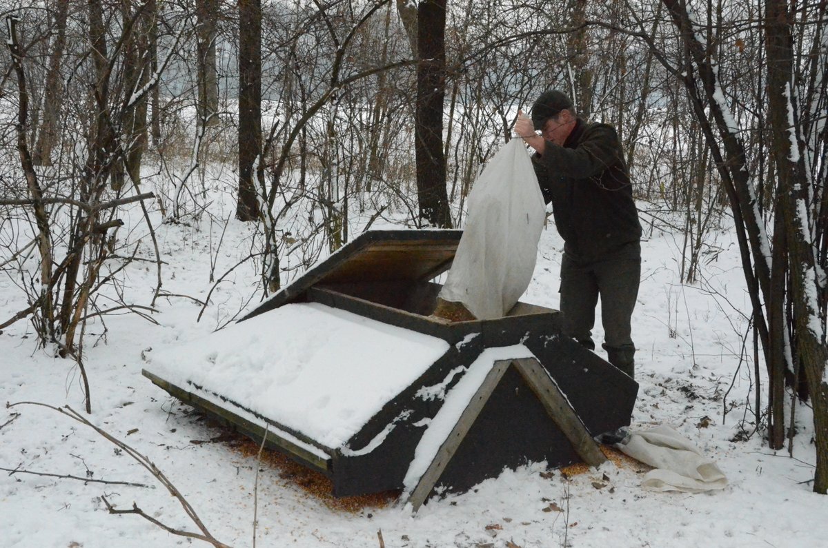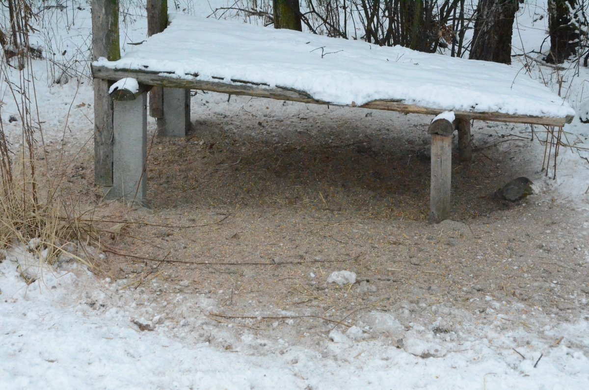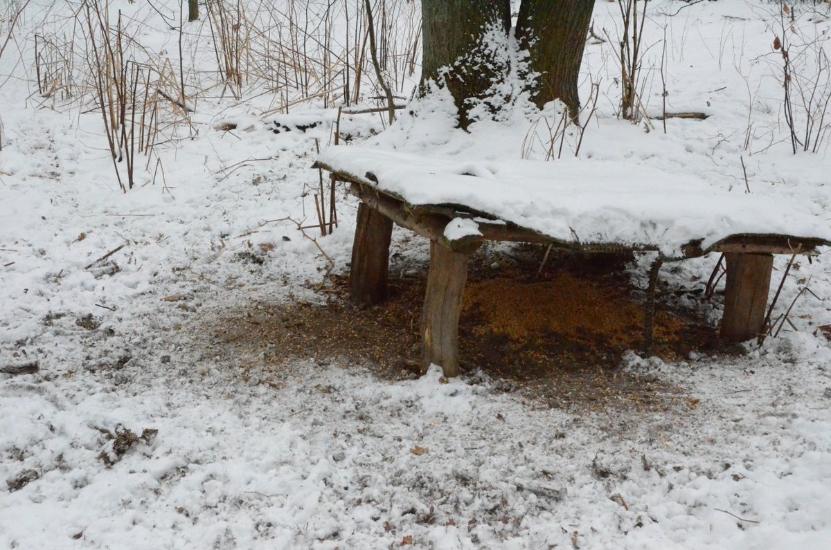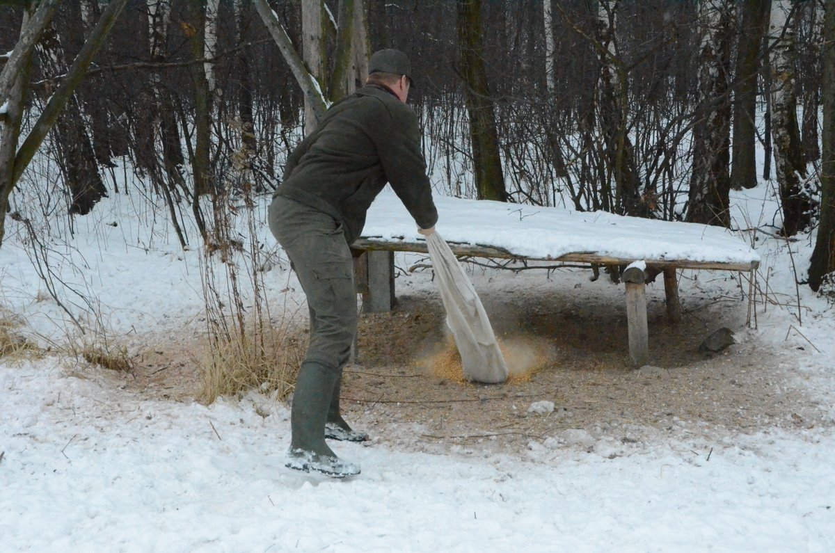 - W grubej warstwie pośladu jeszcze jest trochę ziarna ale trzeba dosypać nowego. Tutaj też liczne tropy bażantów, obok sarnich cewek