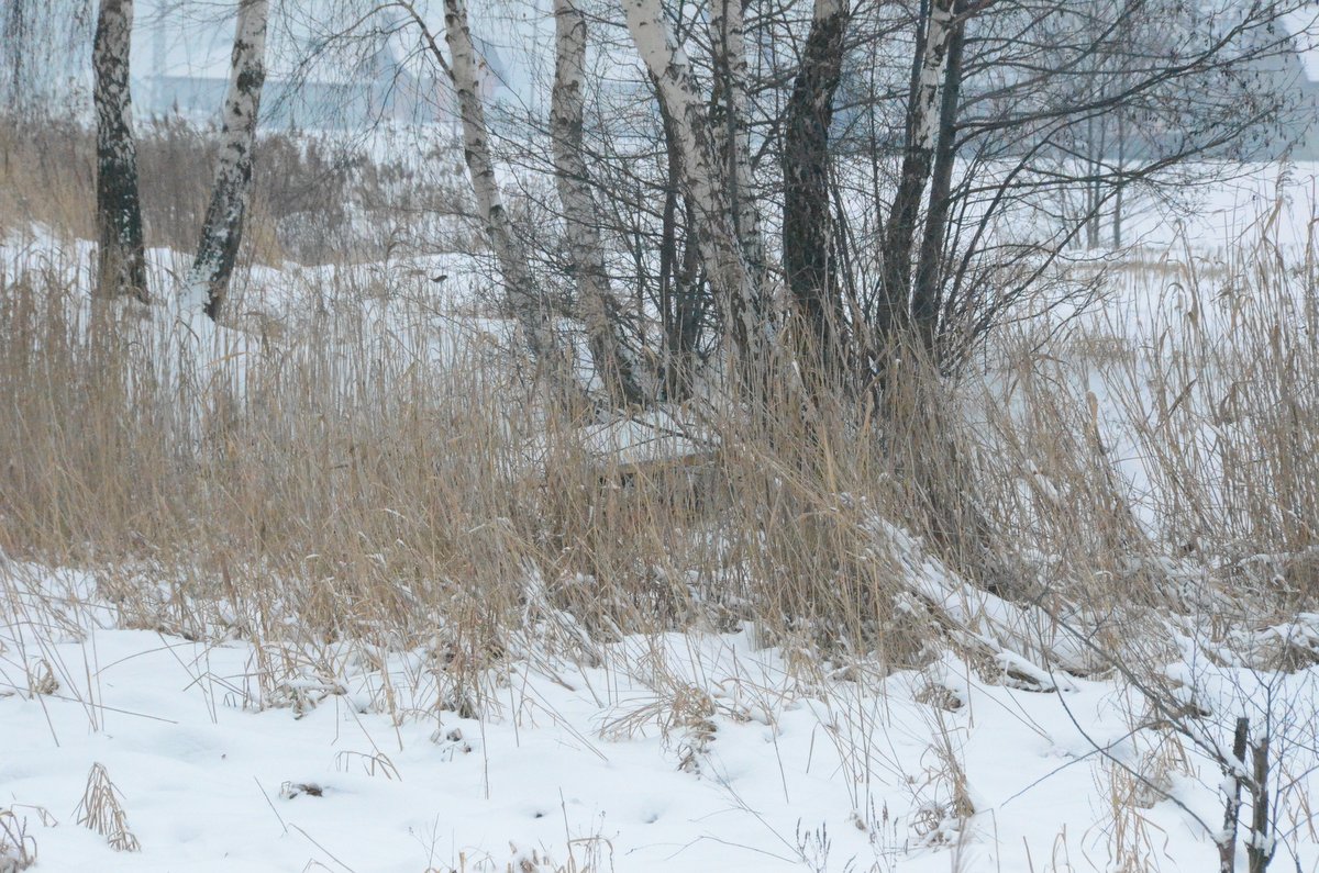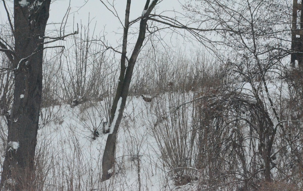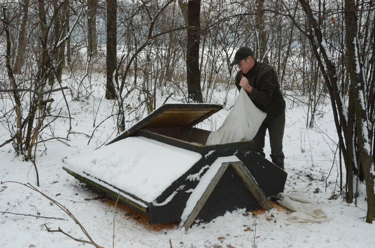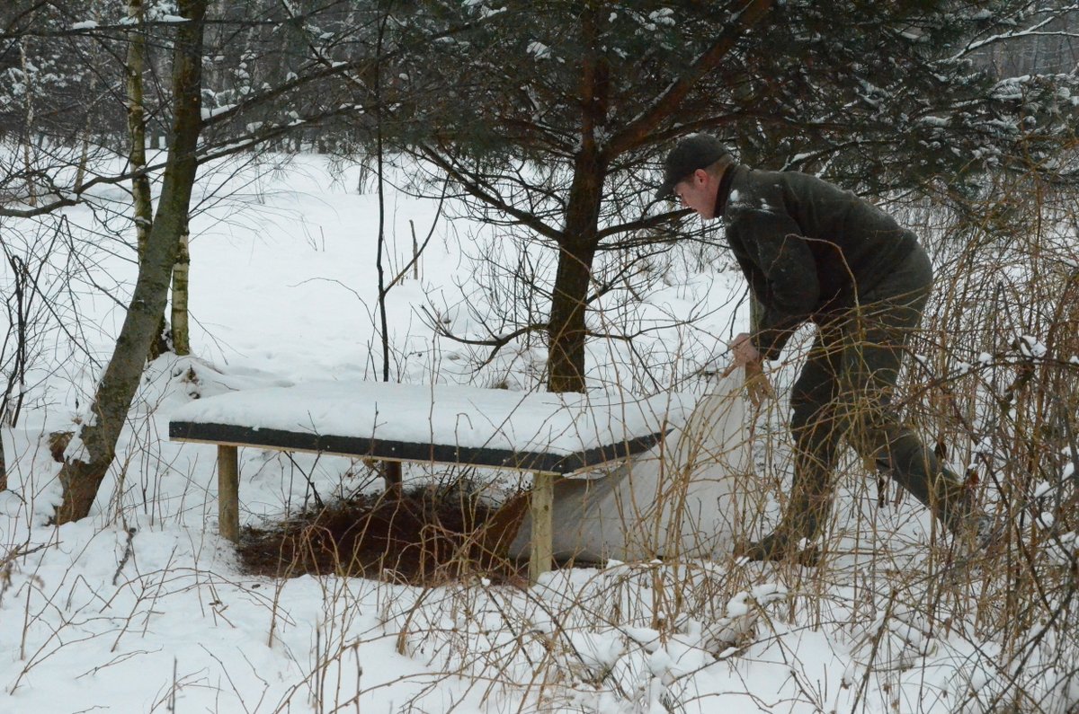 - W grubej warstwie pośladu jeszcze jest trochę ziarna ale trzeba dosypać nowego. Tutaj też liczne tropy bażantów, obok sarnich cewek