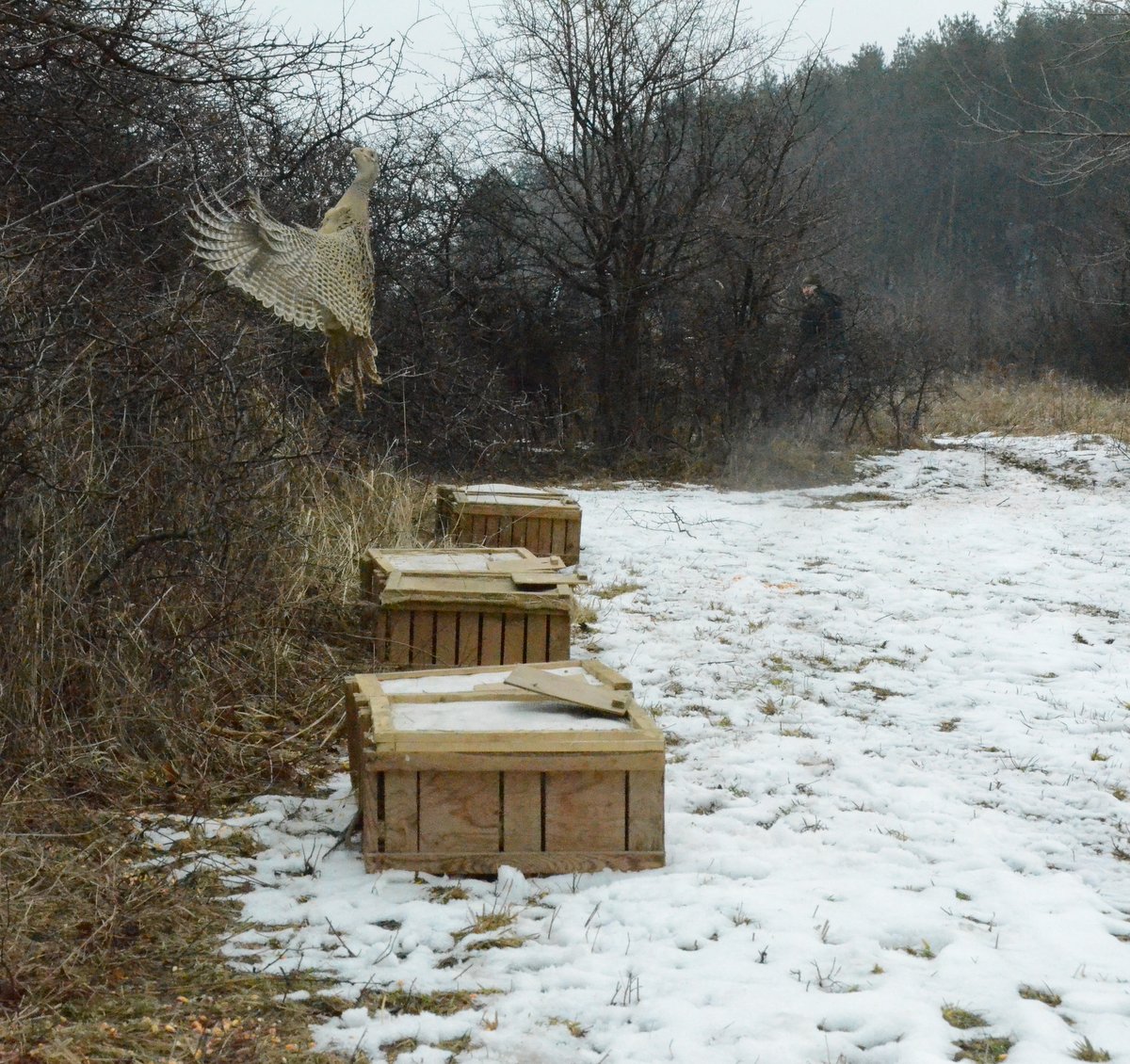 Na niezamarzniętych wodach gromadzą się stada krzyżówek cierpliwie czekając na nadchodzący czas lęgów, na polach widać grupy zajęcy zajętych parkotami, kończy się cieczka lisów – jednym słowem kończy się zima i zaczyna się oczekiwanie na nadchodzącą wiosnę. W łowiskach sezon polowań praktycznie się skończył i nadszedł czas prac gospodarczych. Ja wybrałem się na akcję wsiedlania bażantów do łowiska kolegów z Górniczego Koła Łowieckiego w Jaworznie, o którym miałem już okazję kilkakrotnie pisać. Koledzy z Jaworzna od lat zasiedlają swój obwód bażantami, zającami i kuropatwą sprowadzanymi z różnych części Polski a ostatnio również z Czech. Niemałe koszty tych introdukcji pokrywają środkami własnymi. pieniędzmi pozyskanymi z gmin, z którymi utrzymują dobre relacje, jak również środkami unijnymi. O efektach ich działań już pisałem, tutaj powiem, że w tym sezonie planują rozpoczęcie polowań na zające a w ograniczonym zakresie od paru lat polują już na kuropatwy. W tym roku podjęli decyzję o wpuszczeniu 400 bażantów ponieważ zaniepokoili się spadkiem liczebności tego kuraka co w ich wymiarze oznacza pozyskanie „jedynie” 500 kogutów wobec zaplanowanego 1000 sztuk (!!!!). Trwa w kole dyskusja nad przyczyną tego zjawiska ale za jeden z ważnych czynników uważają koledzy gwałtowny wzrost populacji dzika na ich terenie. W ciągu kilkunastu lat pozyskanie wzrosło z kilku do 90 sztuk w bieżącym sezonie. Całe koło aktywnie współtworzy sukces swojego obwodu ale z pewnością wielka zasługa jest po stronie zarządu koła, który nie szczędząc swojego czasu a i własnych pieniędzy, aktywnie organizuje kolegów o czym również świadczyć będą zdjęcia poniższej galerii. Zapraszam do oglądania i do wyciągnięcia wniosków we własnych środowiskach.