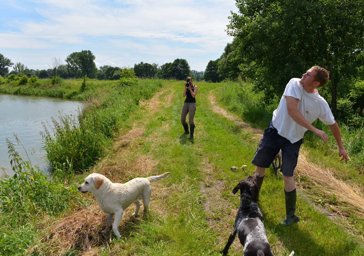 W czerwcowe, upalne południe wybraliśmy się nad rozległe Goczałkowickie stawy w składzie; Marta, Maciek, autor tej krótkiej notatki oraz Gapa, Goran i labradorka Pufa. Nadszedł czas treningu aportu z wody a przy okazji zabawy, w nowym dla szczeniaków środowisku ich przyszłej łowieckiej pracy. Królową drewnianego koziołka została tego dnia niezmordowana w wodzie Pufa która, choć jest niezwykle poczciwego charakteru, coraz wyraźniej ujawnia pasję łowiecką i typowe dla labradorów zacięcie do pracy w wodzie. Poniżej kilka zdjęć z tego wypadu.