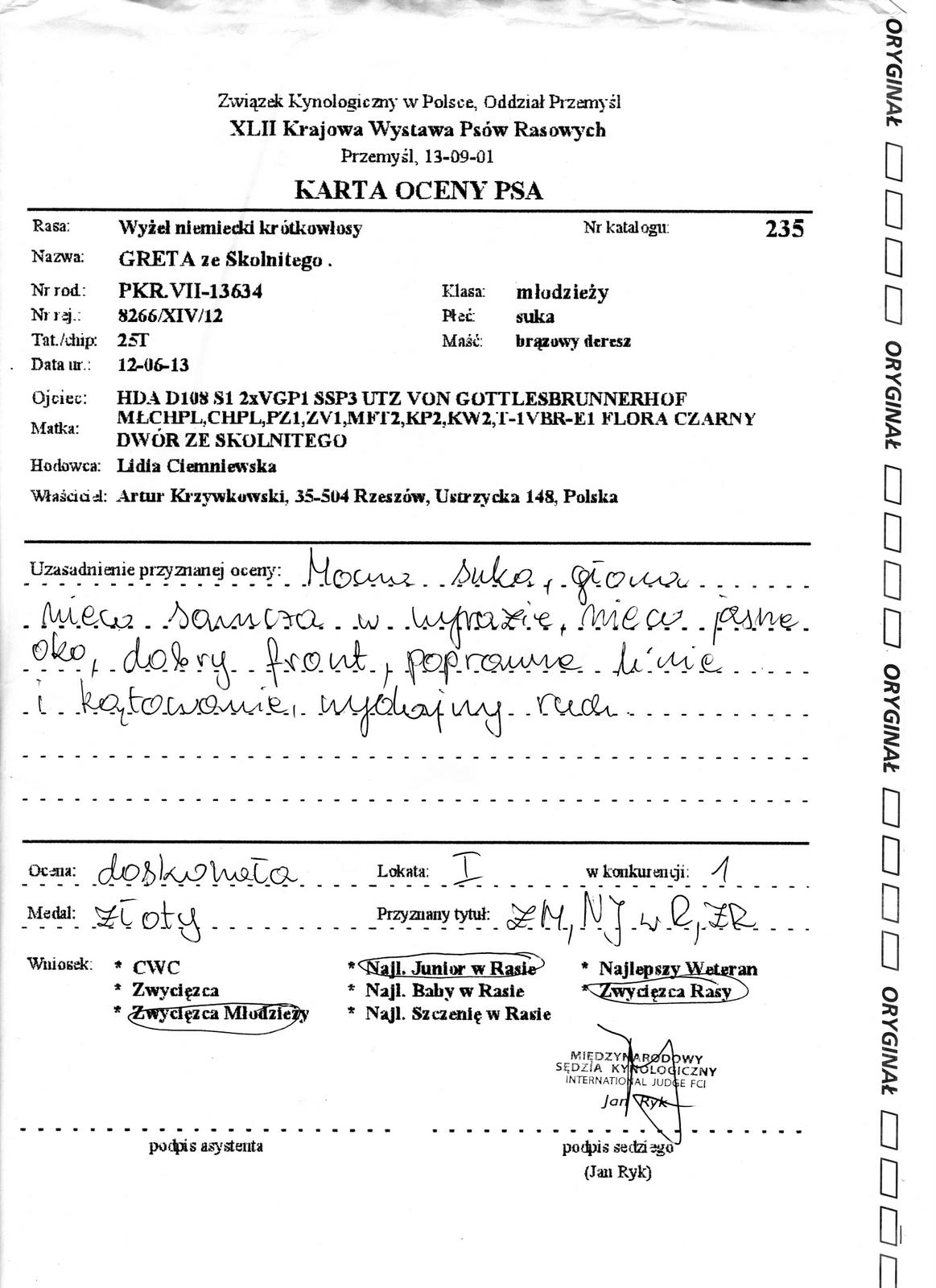 GRETA ze Skolnitego, córka Flory powędrowała na Podkarpacie. Minął rok, suczka dorosła i zaczął się dla niej i dla właściciela czas łowów a również sprawdzianów polowych i wystaw. Ostatni weekend cała rodzina spędziła bardzo pracowicie startując na Próbach Polowych Wyżłów w Pszczynie a następnego dnia, paręset kilometrów dalej, na Krajowej Wystawie Psów w Przemyślu. Oba występy można zaliczyć do bardzo udanych. Próby GRETA zaliczyła z dyplomem I stopnia, uzyskując 95/100 pkt. i zdobywając 5 lokatę na 24 startujące wyżły. Sądzę, że byłoby jeszcze lepiej gdyby suczka znała zapach hodowlanego bażanta wcześniej. Ma wielką pasję do pracy i piękną stójkę. Właściciel Grety (w domu zwanej Lora) aktywnie poluje w obwodzie gdzie są zarówno kuropatwy jak i bażanty tak, że jestem pewien jej kariera łowiecka i konkursowa dopiero się zaczyna. Na wystawie, choć konkurencja była nieliczna, też było bardzo dobrze – Najlepszy Junior w Rasie oraz Zwycięstwo Rasy z oceną oczywiście doskonałą. Czego można sobie życzyć więcej w czasie pierwszego występu na ringu? Poniżej dokumenty z imprez oraz rodowód suczki. Gratuluję właścicielowi i zachęcam do dalszej pracy.