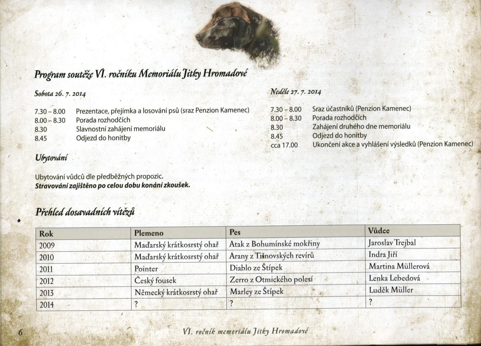 W bardzo upalny weekend odbył się kolejny, szósty już Memoriał imienia J.Hromadove. W memoriałowe szranki stanęły 22 wyżły różnych ras (spośród 24 zgłoszonych) – 10 wyżłów niemieckich krótkowłosych, 6 wyżłów węgierskich krótkowłosych, 1 wyżeł węgierski szorstkowłosy, 2 wyżły weimarskie krótkowłose, 1 czeski fousek, 1 słowacki wyżeł szorstkowłosy, 1 wyżeł niemiecki szorstkowłosy, 1 pointer, 1 seter gordon. Zgłoszono 16 psów czeskich, 3 słowackie, 3 polskie, 1 psa z Ukrainy i 1 z Rosji. Jak widać, stawka psów była bardzo ciekawa i dająca szansę obserwatorom na zapoznanie się ze stylem pracy różnych wyżłów pracujących w warunkach konkursu wszechstronnego. Dla przypomnienia, memoriał składa się z 3 konkursów – prób polowych, konkursu pracy na wodzie oraz konkursu pracy w lesie, a łączny wynik z wszystkich składowych daje pozycję psa w całym memoriale.